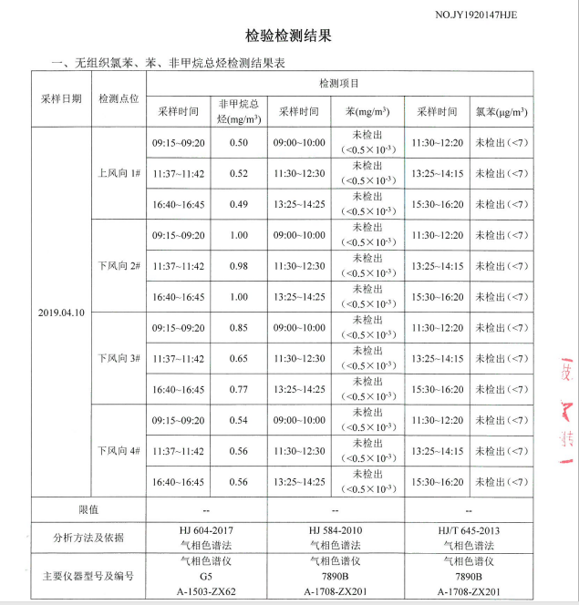 公司2019年4月10日至12日委托山东嘉源检测技术公司对vocs进行了检测,检测结果如下图:……